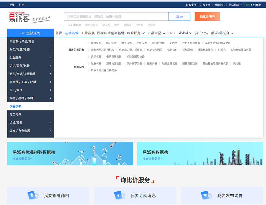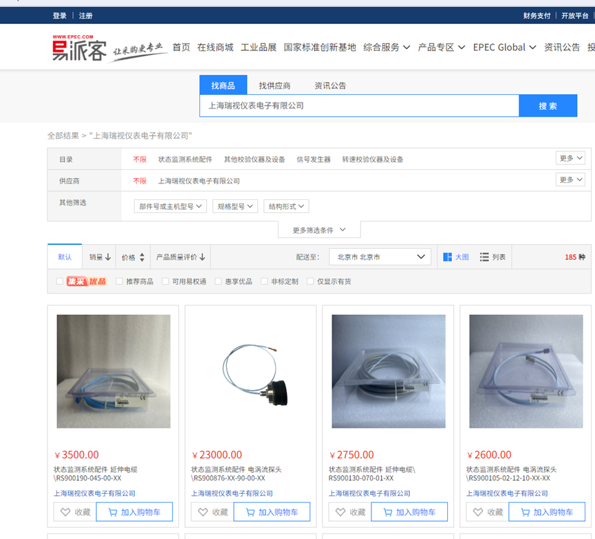 方法二:百度搜索易派客官网或登录易派客网址https://emall.epec.com/点击在线商城,在左侧全部分类里面找到仪器仪表,在仪器仪表子目录里面找到工业自动化系统及配件点击后在供应商栏找到上海瑞视仪表电子有限公司即可找到公司上传的所有产品及参考价格(示例如下图)。