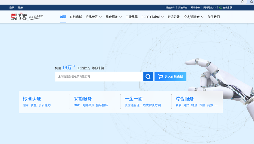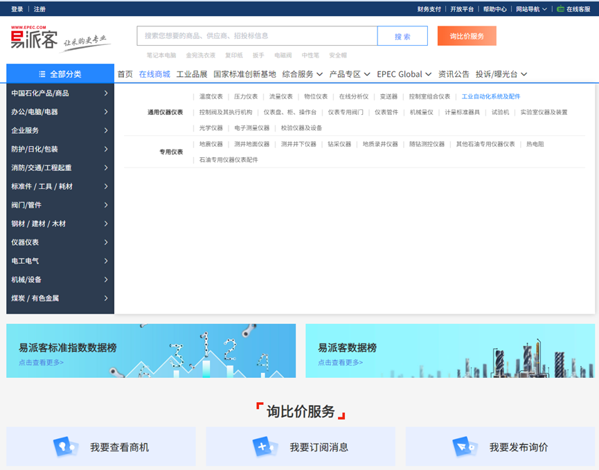 方法二:百度搜索易派客官网或登录易派客网址https://emall.epec.com/点击在线商城,在左侧全部分类里面找到仪器仪表,在仪器仪表子目录里面找到工业自动化系统及配件点击后在供应商栏找到上海瑞视仪表电子有限公司即可找到公司上传的所有产品及参考价格(示例如下图)。